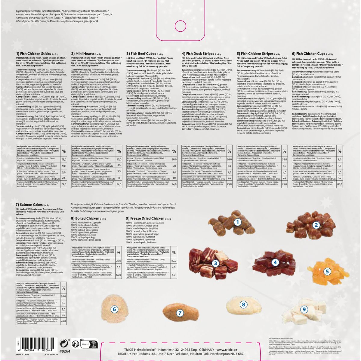 • Mini Hearts: Hühnchen (31%), Fisch (28%), pflanzliche Eiweißextrakte, Kartoffelstärke, Reismehl, Sorbit, pflanzliche Nebenprodukte, Mineralstoffe.