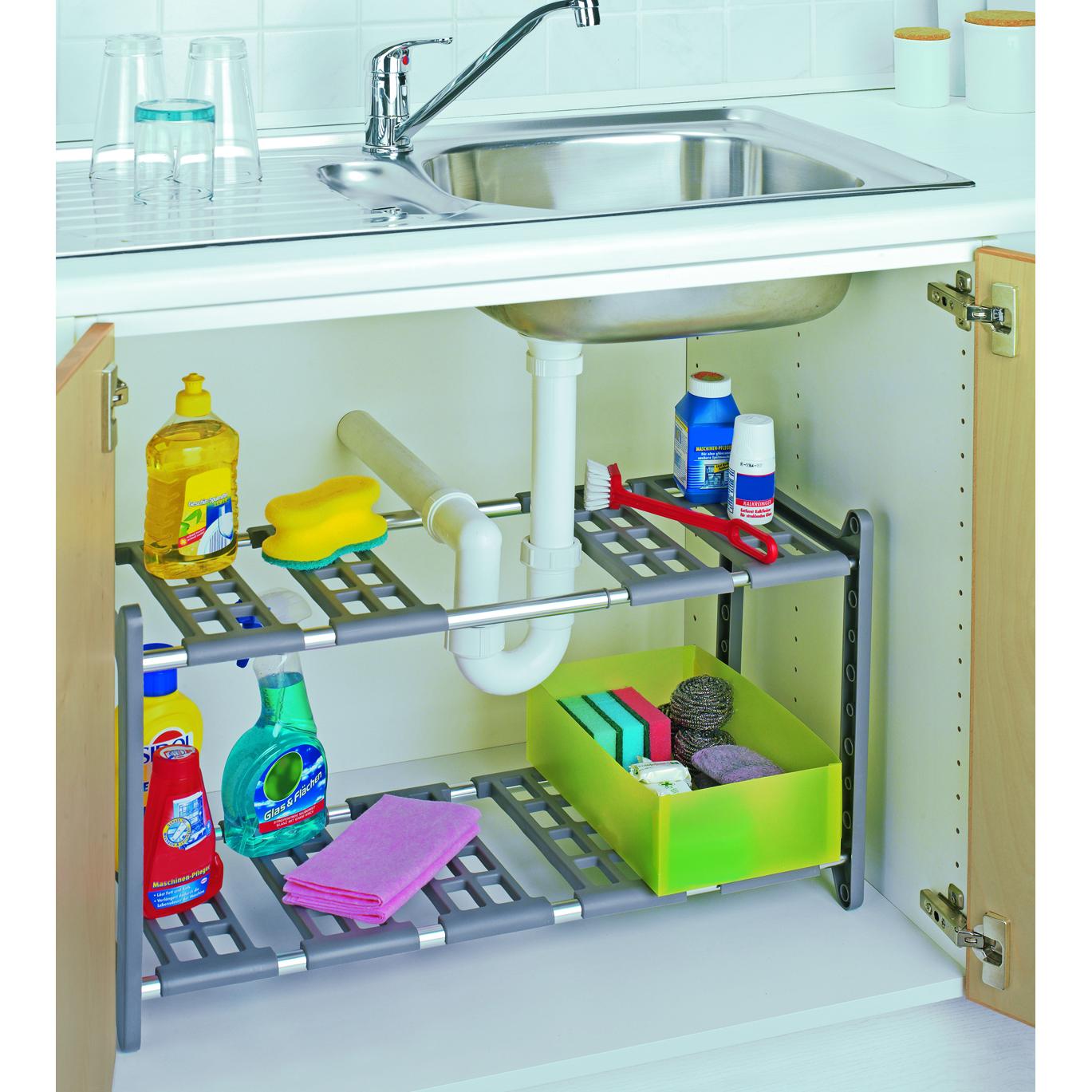 Ideal für den Spülenunterschrank. Verstellbare Regalböden passen sich dem Platz an. Aussparungen für Siphon, Abfluss und Rohre ermöglichen eine einfache Justierung.
