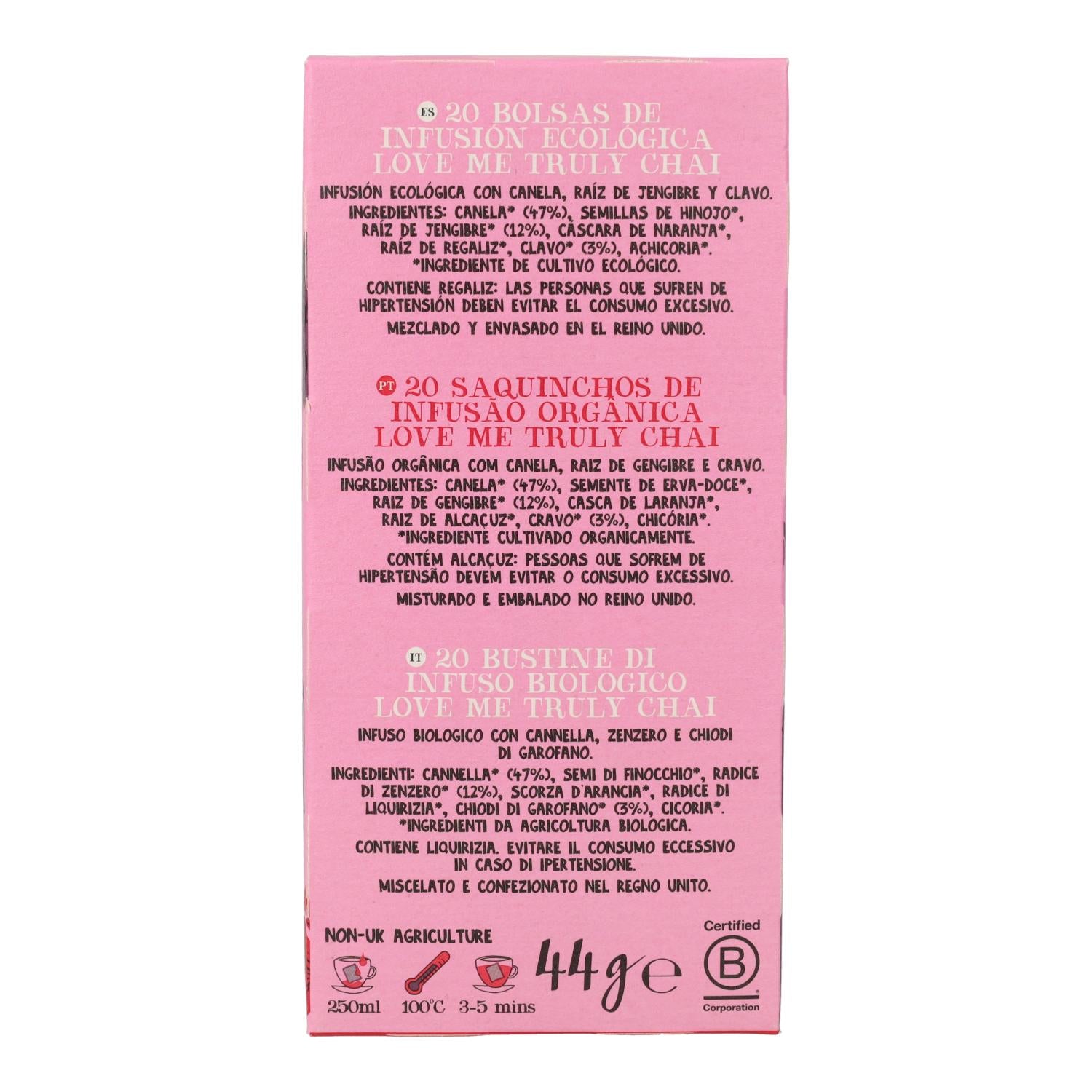 Bio-Chai-Aufguss mit traditionellen Gewürzen wie Zimt, Ingwer, Nelken und Süßholz. Ideal für Momente des Wohlbefindens und der Entspannung. Sein würzig-süßer Geschmack macht ihn zu einem perfekten Genuss zu jeder Tageszeit.