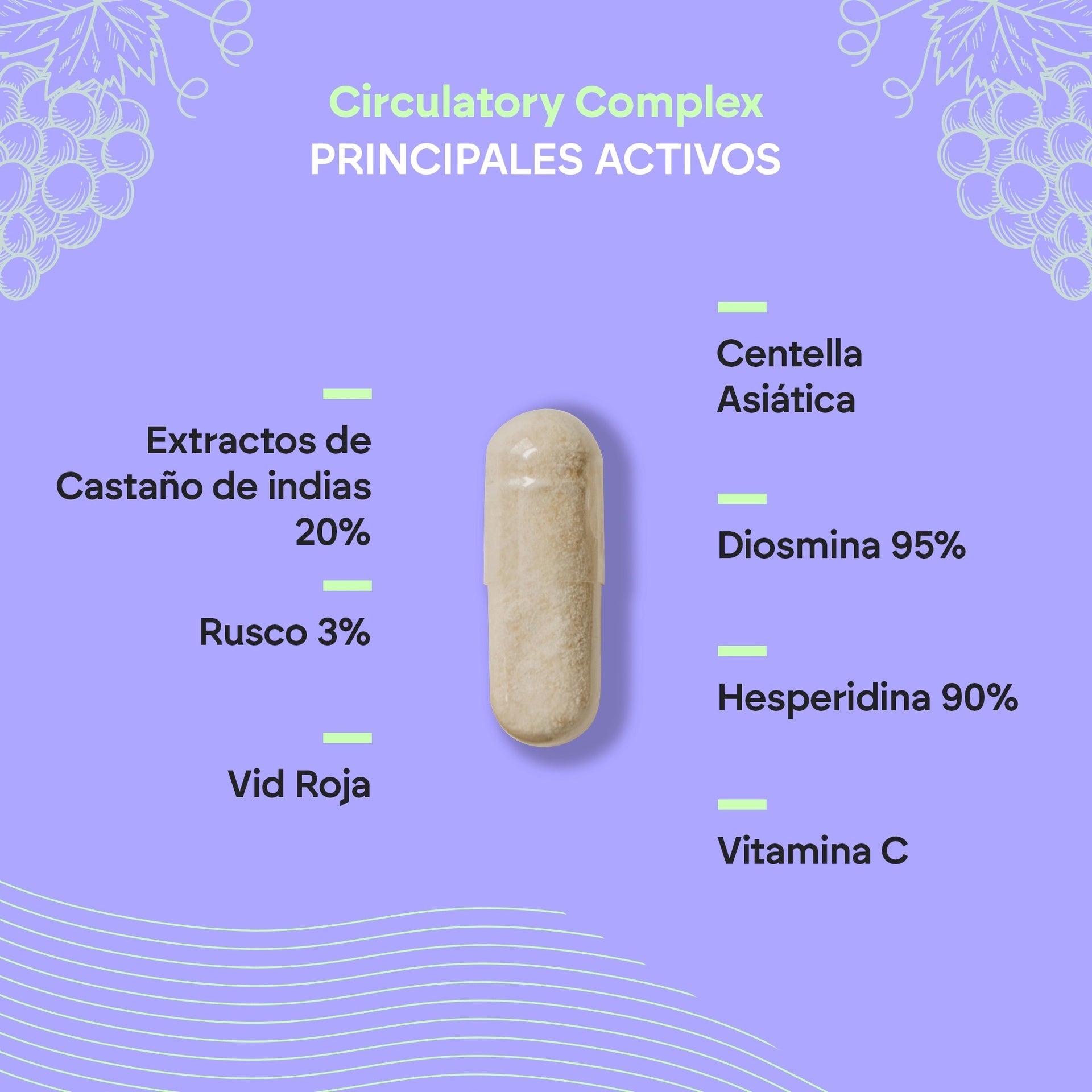 Circulatory Complex de Nutralie es un suplemento compuesto por una fórmula complex que contiene Extractos de Castaño de indias, Rusco, Vid Roja, Centella Asiática, Diosmina y Hesperidina.