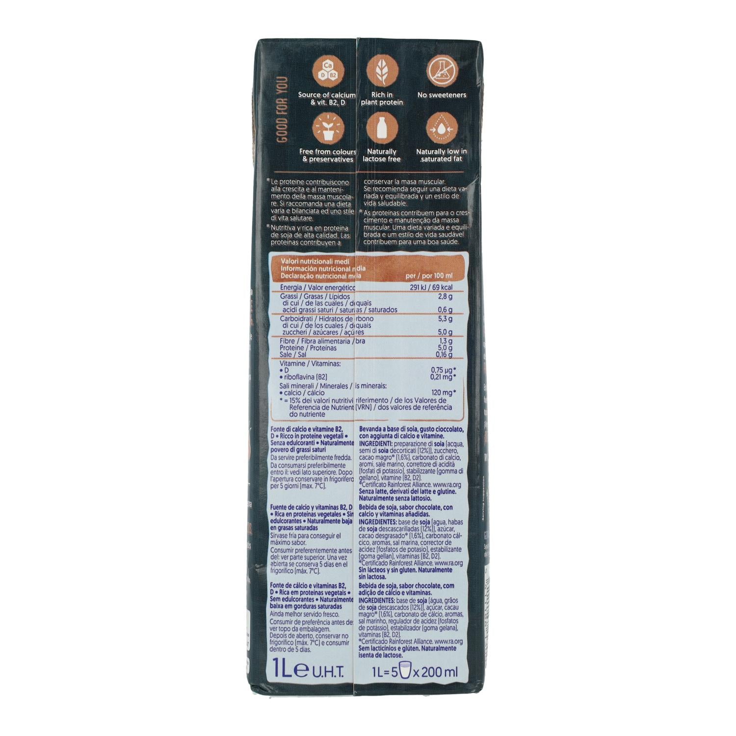 Ingredientes: base de soja (agua, habas de soja descascarilladas (12%)), azúcar, cacao desgrasado* (1,6%), carbonato cálcico, aromas,sal marina, corrector de acidez (fosfatos de potasio), estabilizante (goma gellan), vitaminas (B2, D2)*certificado Rainforest Alliance. www.ra.org.