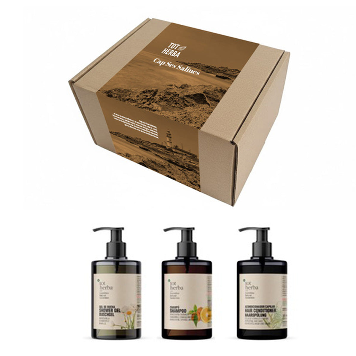 Pack de regalo de tres esenciales mediterráneos: manzanilla, cítricos y salvia. Contiene: Gel de ducha de manzanilla 300ml, Champú de naranja mandarina y menta 300ml y Acondicionador de cola de caballo y salvia 300 ml.