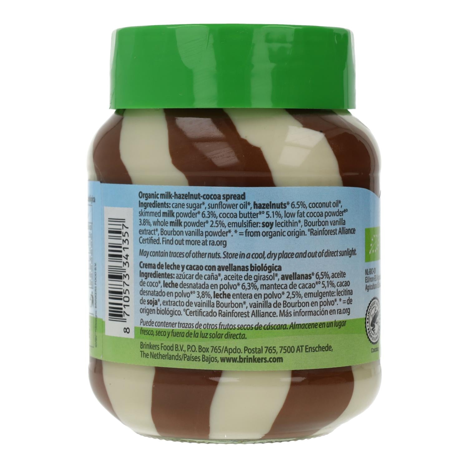 Une délicieuse pâte à tartiner au chocolat duo, onctueuse et crémeuse, élaborée à partir d'ingrédients biologiques certifiés de haute qualité. Première pâte à tartiner au chocolat certifiée biologique UTZ, elle garantit une agriculture durable et de meilleures conditions pour les agriculteurs et la planète. Contient de l'huile de tournesol et un arôme équilibré de noisette et de cacao.