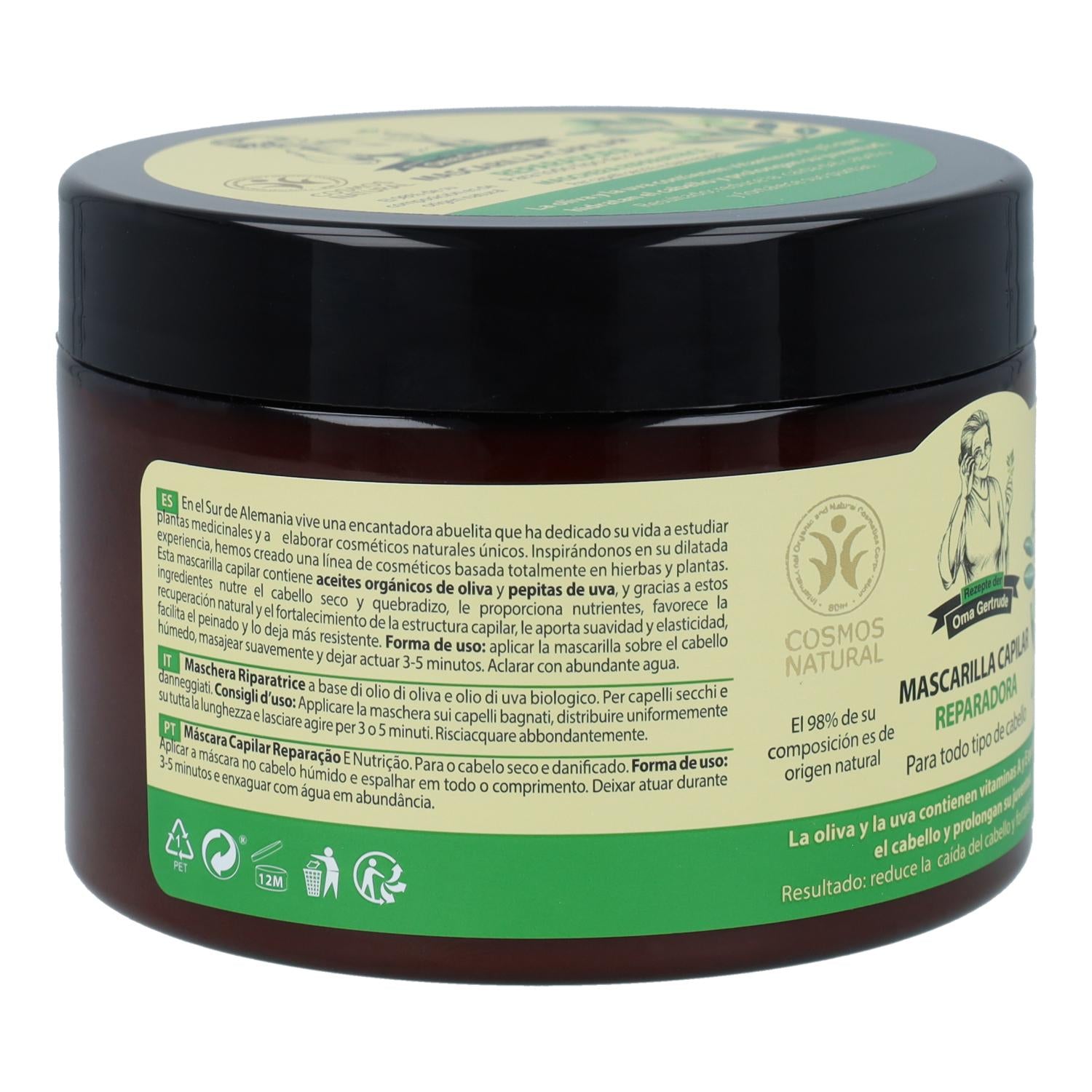 La Oliva y la Uva, que contienen vitaminas A y E, hidratan el cabello devolviéndole y contribuyendo a la prolongación de la juventud. Después del uso de la mascarilla las raíces del cabello se fortalecen y se reduce la caída del cabello. La Mascarilla Capilar Reparación y Nutrición, a base de aceites orgánicos de oliva y uva, nutre e hidrata a la perfección el cabello seco y dañado, contribuye a reforzar y a restaurar su estructura aportándole suavidad y elasticidad a la vez que facilita el peinado.