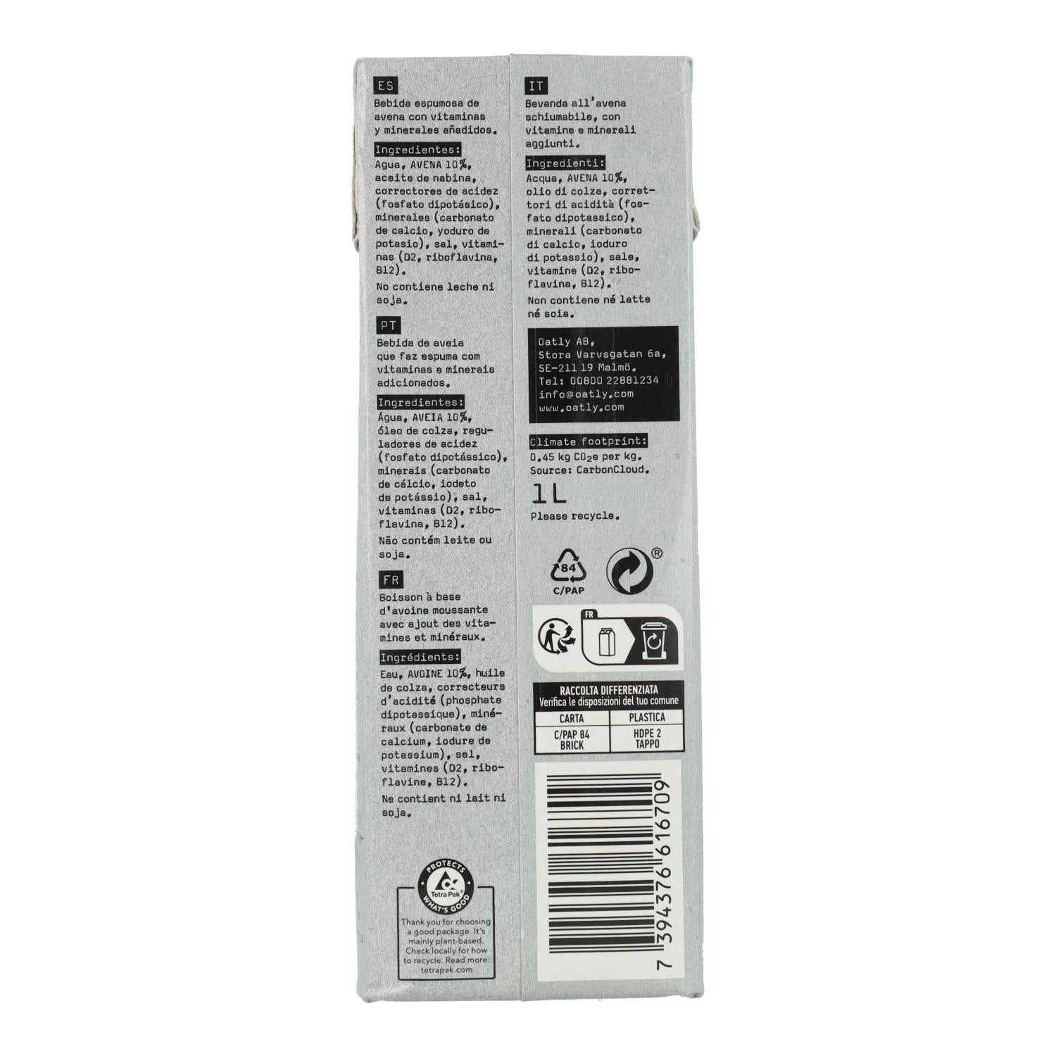 Ingredientes: Base de avena (agua, avena 10%), aceite de colza, regulador de acidez (fosfato dipotácico), carbonato de calcio, fosfatos de calcio, sal yodada, vitaminas (D2, riboflavina, B12)