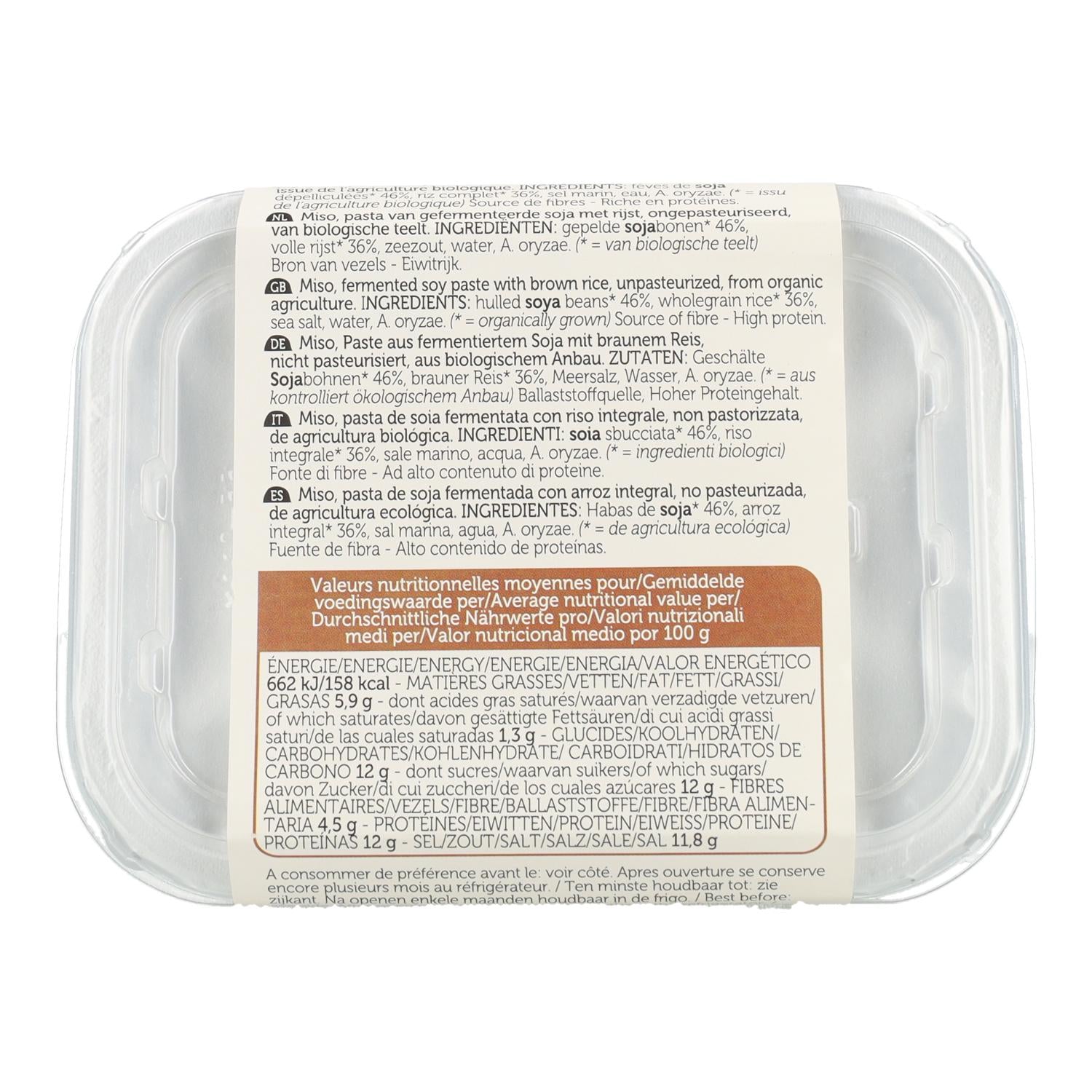 Ingredientes: Habas de soja* 46 %, arroz integral* 36 %, sal marina, agua, A. oryzae.* de agricultura ecológica.