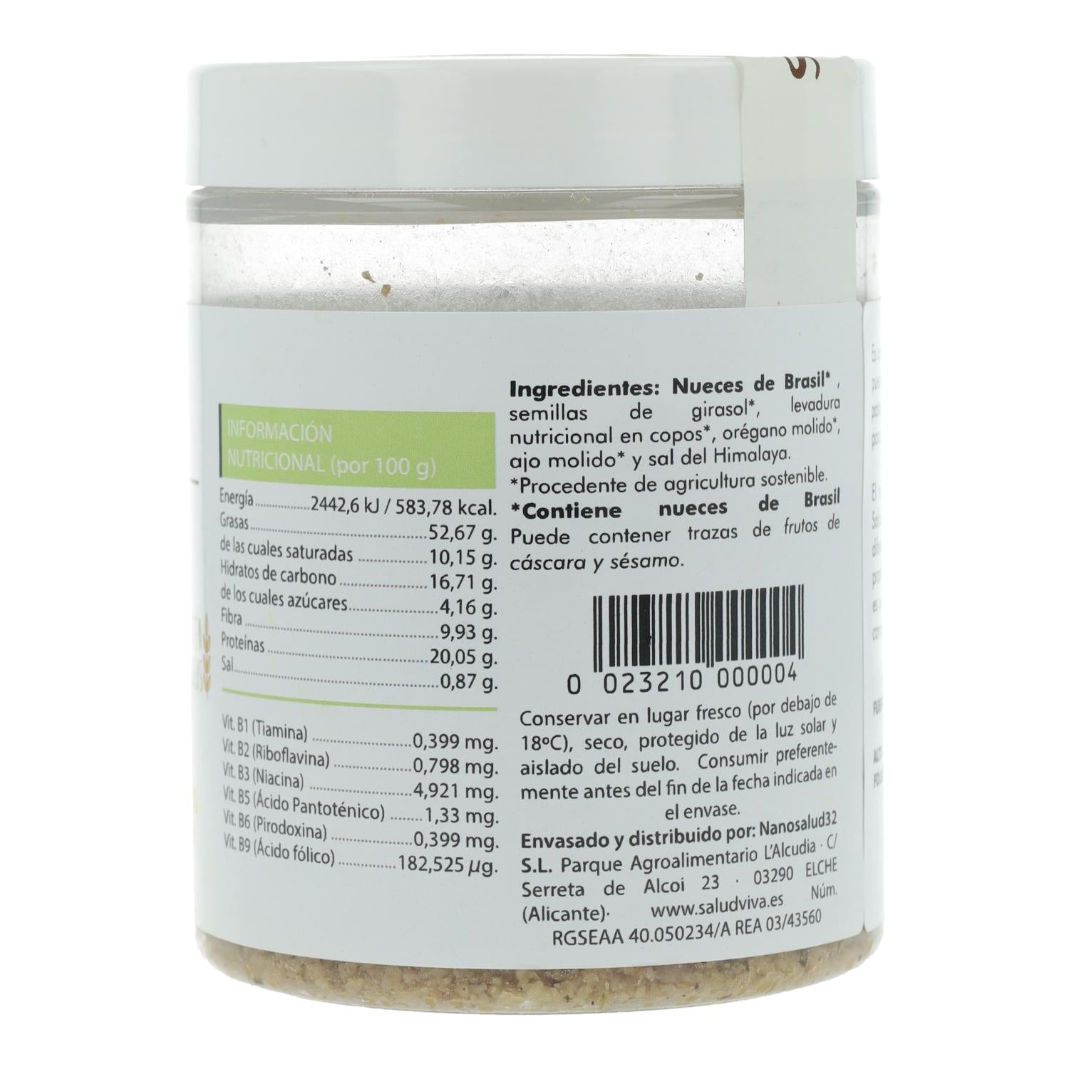 Nueces de Brasil* , semillas de girasol*, levadura en copos*, orégano molido*, ajo molido* y sal del Himalaya.