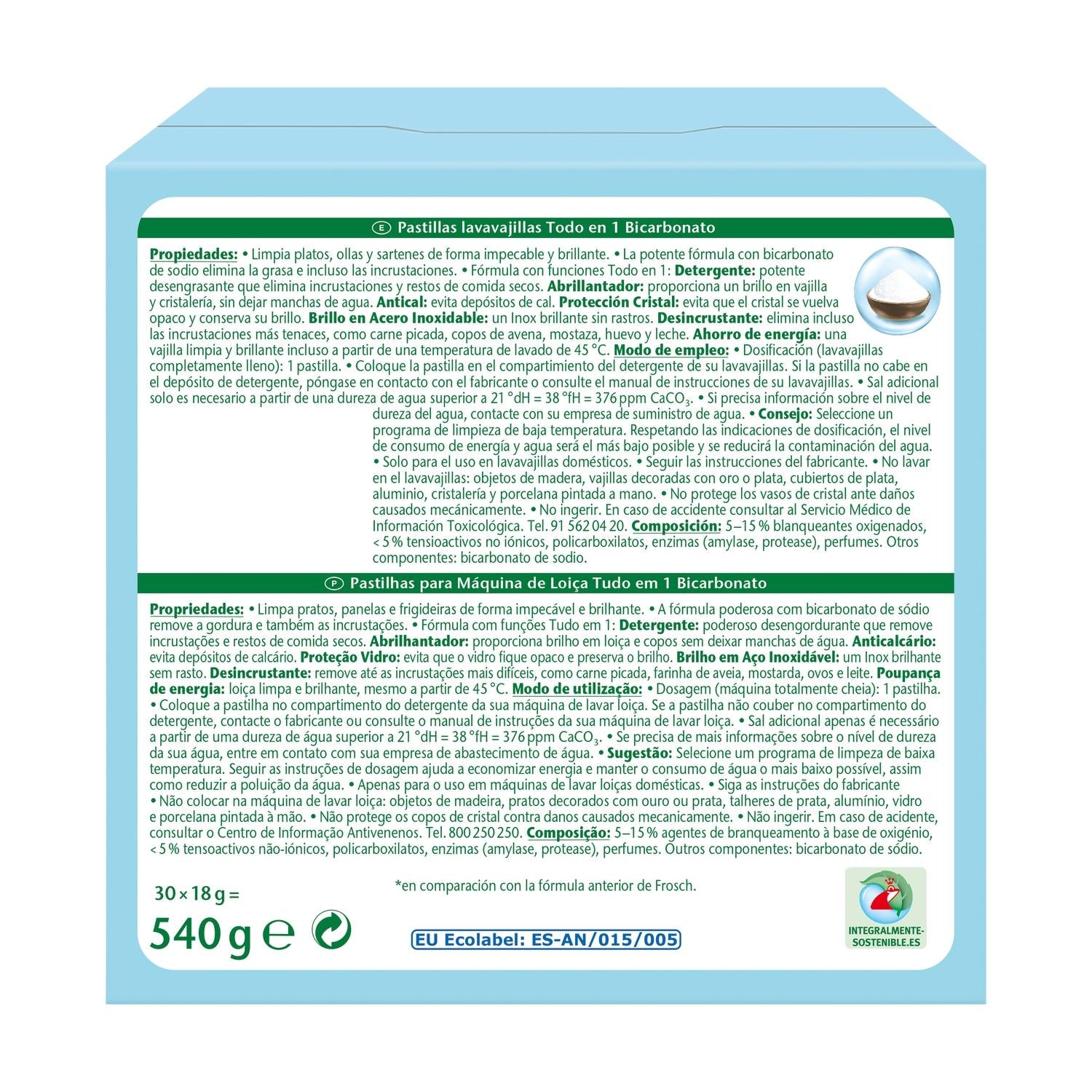 Las tabletas para lavavajillas Frosch Eco All-in-One tienen una fórmula de bicarbonato de sodio que limpia en profundidad y elimina toda la grasa, incluso las incrustaciones secas. Actúa como detergente: la fórmula de bicarbonato de sodio natural elimina incluso los restos de comida seca y como abrillantador: hace brillar platos y cristalería, sin dejar manchas de agua.