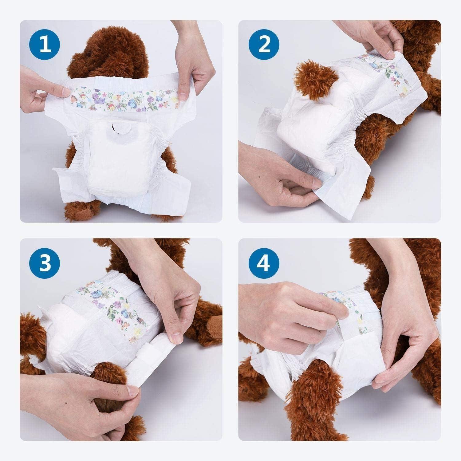 - SEGURIDAD E HIGIENE: Los pañales desechables son de seguridad e higiene. Un 1 paquetes total de 12 pañales desechables. Cada pañal se mantiene en su lugar usando sujetadores que no dañan el pelaje y evitan que el pañal se deslice de su perro.