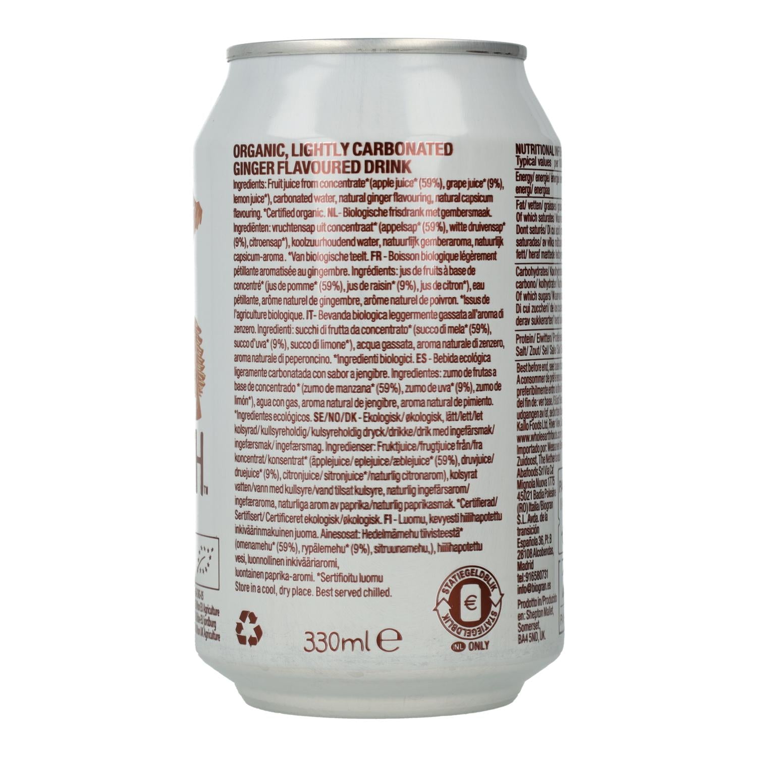 Agua con gas, zumo de manzana ecológico a base de concentrado (12%), sirope de agave ecológico (7%), zumo de uva ecológico a base de concentrado (6%), zumo de limón ecológico a base de concentrado (2%), extracto de raíz de jengibre, aroma natural de jengibre.