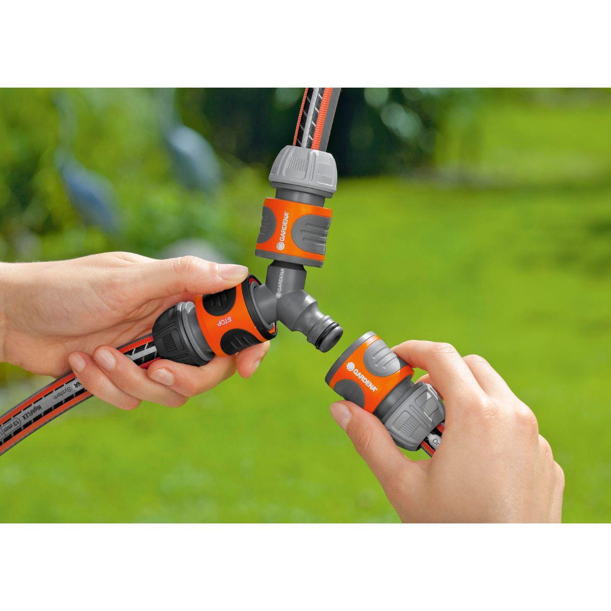 Para la unión rápida de 2 tramos de manguera. Para la unión rápida de 2 tramos de manguera, a otro tramo inicial obteniendo una bifurcación. Esto permite realizar varias tareas a la vez en el jardín. Como por ejemplo, regar el césped con aspersores mientras utiliza la manguera para regar las macetas de flores.