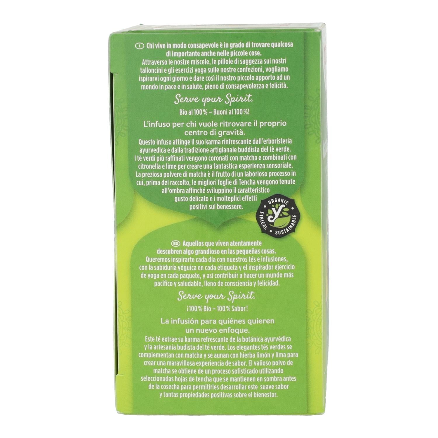Infusión orgánica que fusiona el té verde Sencha con polvo de matcha, hierba limón y cítricos, creando una mezcla refrescante y armoniosa.