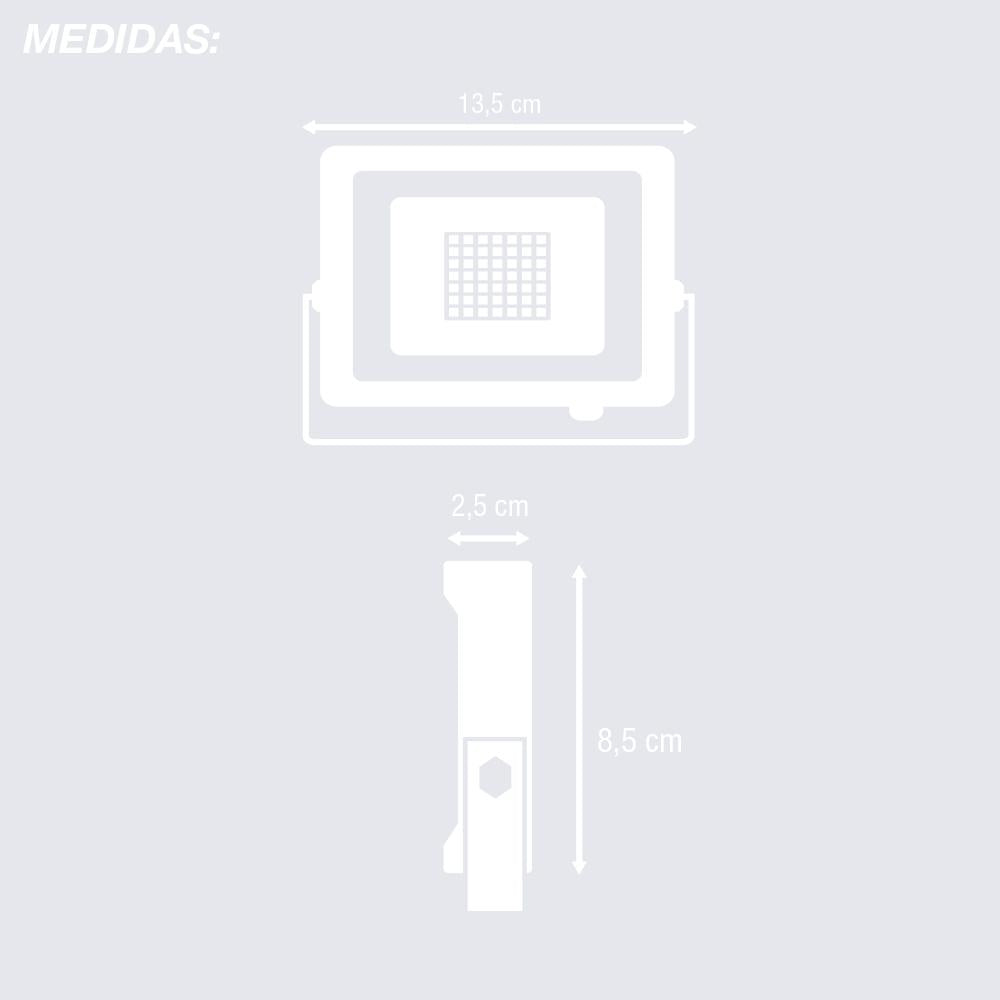 Proyector fijo LED de SIMON hecho de aluminio con acabado en negro. El foco ofrece una iluminación en luz blanca fría con una potencia de 10 vatios con una intensidad de 900 lúmenes y un ángulo de apertura de 120º. Está diseñado para ofrecer una muy alta protección frente al polvo y frente a agua a presión, pudiéndose usarse tanto en interiores como en exteriores. Además, tiene un soporte giratorio que permite adaptar el ángulo de iluminación según las necesidades.