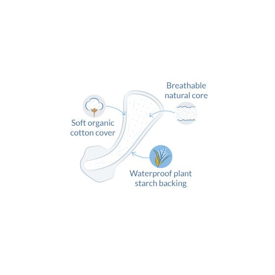 Ingredientes: Algodón orgánico certificado, pulpa de celulosa ecológicamente certificada, almidón de maíz sin OGM, adhesivo inocuo para la salud
